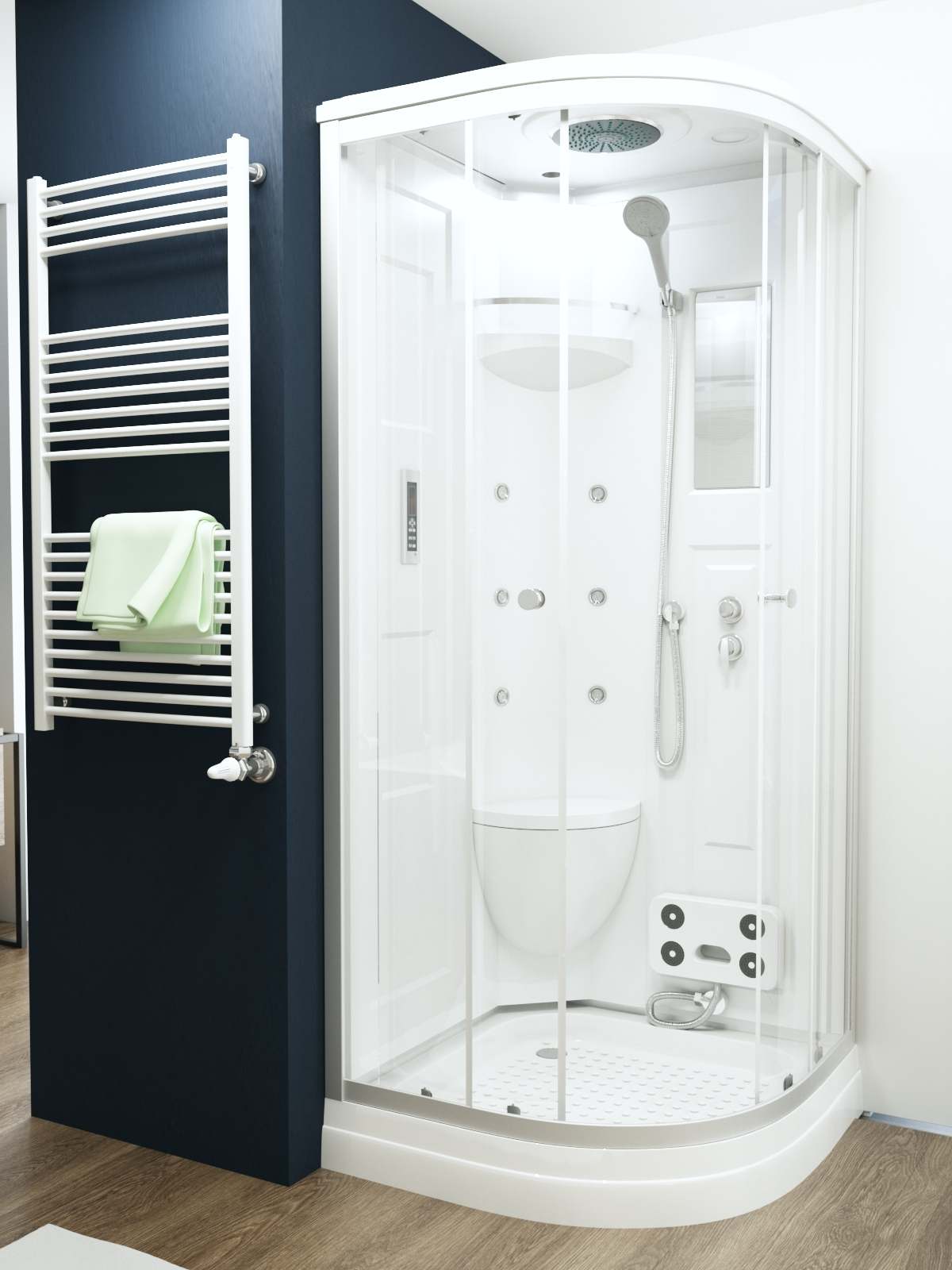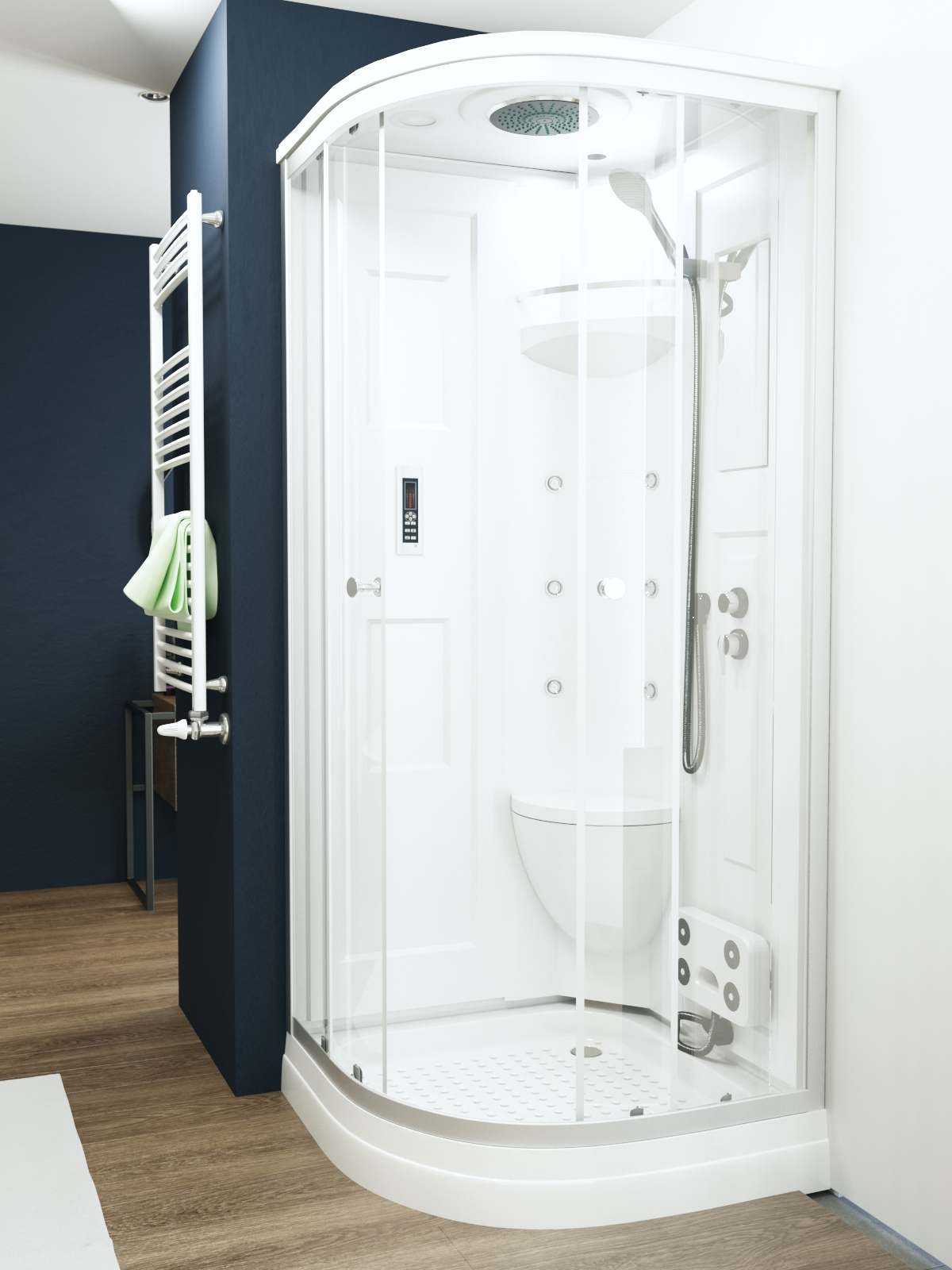 Negyedköríves hidromasszázs zuhanykabin elektronikával 90x90x222cm Üvegszál erősítéses, acél merevítésű, fehér színű, akril zuhanytálca, állítható fém lábakkal. Matt króm alumíniumívek és profilok. 5 mm víztiszta biztonsági üvegek és ajtók. Akril hátfal, beépített ülőkével és polcokkal. 6 db hidromasszázs fúvóka. Rádió. Felső világítás. Ventilátor. Kézi zuhany. Felső esőztető zuhany. Kerámia betétes keverőszelep és funkció váltó. Tükör. Mágneses ajtózár. Görgős ajtónyitás. Leeresztő szelep.