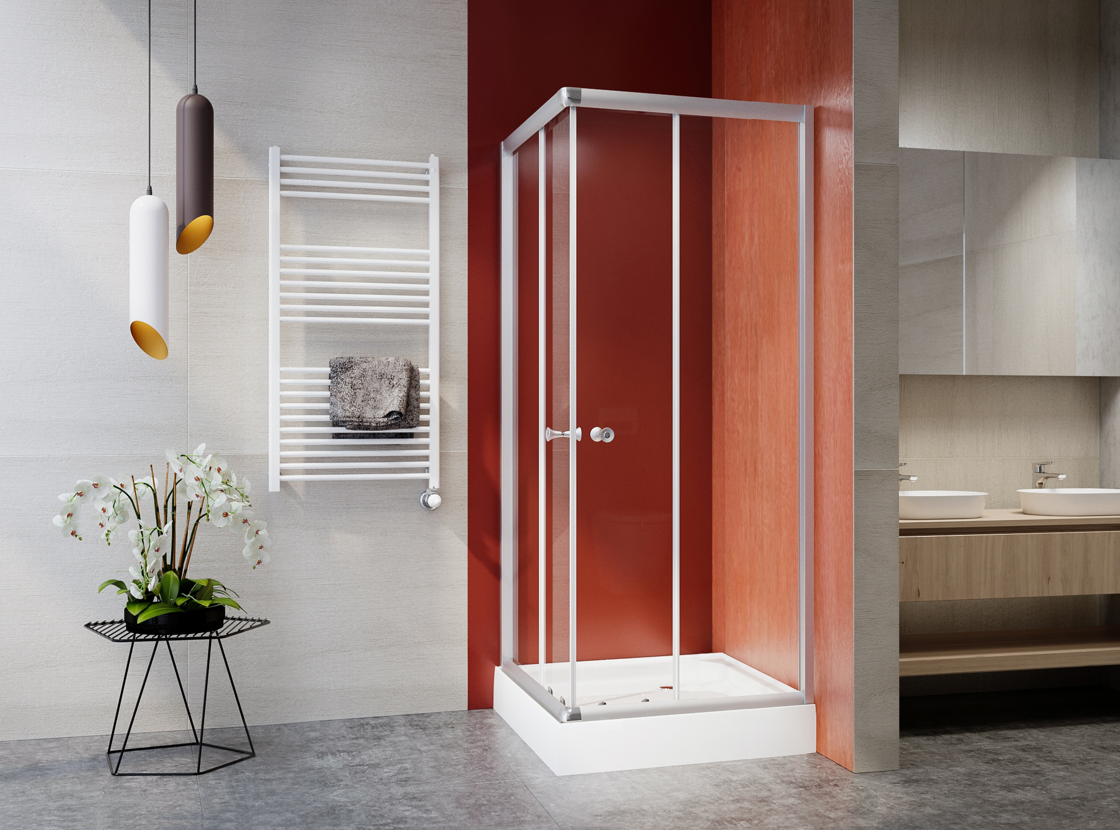 Szögeletes zuhanykabin 90x90x185 cm (beépítési méret: 87-89 cm) 5 mm vastag, víztiszta, edzett biztonsági üvegek és ajtók Polirozott alumínium profilok Mágneses ajtózár. Görgős ajtónyitás. Króm fogantyúk.