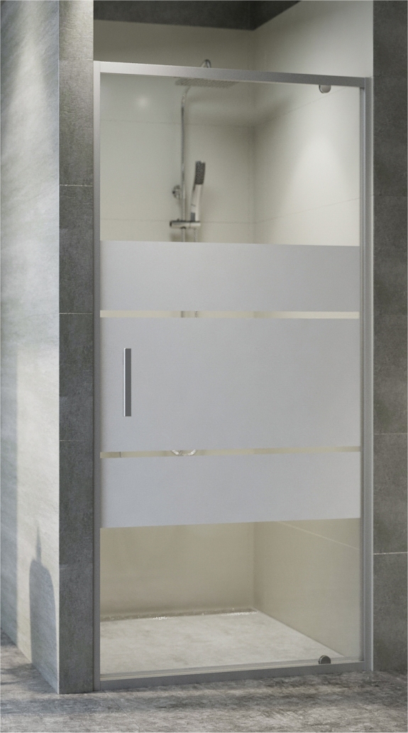 Zuhanykabin ajtó - 185 cm magas. Állítható szélesség 89-91 cm között. 5 mm vastag, csíkos, edzett biztonsági üveg. Krómozott fém zsanér. Szinterezett fehér fém profil. Jobbos-balos szerelhetőség. Fehér fogantyú. Műanyag vízvető. Mágneses zár.