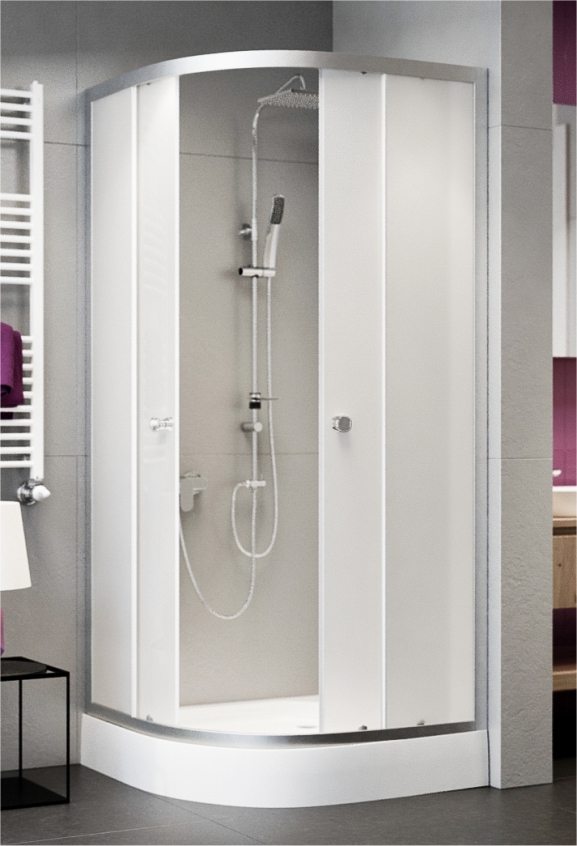 Negyedköríves zuhanykabin 90x90x185cm 5 mm vastag, katedrál biztonsági üvegek és ajtók. Polírozott ívek és profilok. Mágneses ajtózár. Görgős ajtónyitás. Krómozott fogantyúk. A mintázott üveg részben átlátható, így biztosítja az intim teret a zuhanyzás során anélkül, hogy teljesen elzárna.