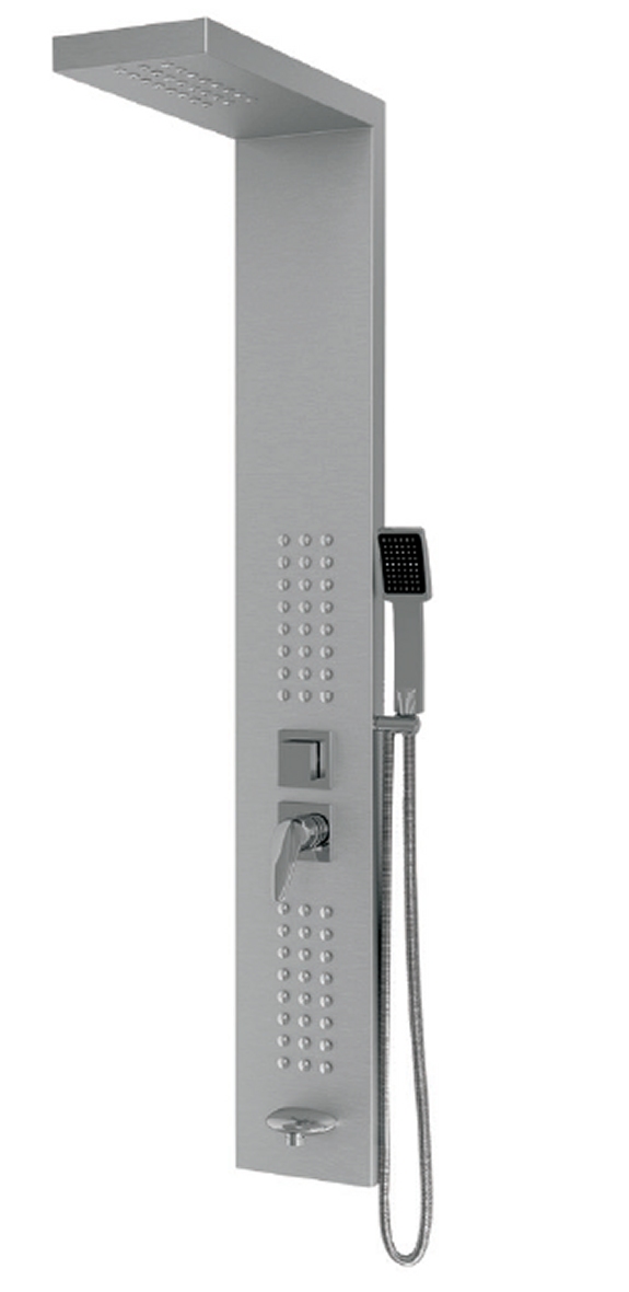 Hidromasszázs zuhanypanel 140x20 cm Matt króm színű alumínium zuhanypanel Hidromasszázs fúvókák Kerámia betétes keverőszelep és Funkcióváltó Kézi zuhany Felső esőztető zuhany Kádtöltő funkció