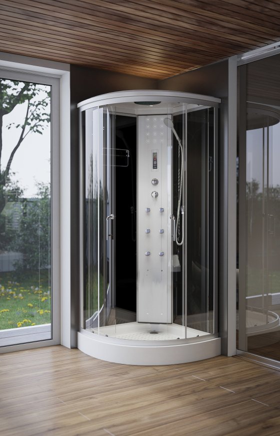 Negyedkörívés hidromasszázs zuhanykabin elektronikával 90x90x215cm Belső magasság 195cm Üvegszál erősítéses, acél merevítésű, fehér színű, akril zuhanytálca, állítható fém lábakkal. Hagyonmányos kialakítású R550 zuhanytálca Matt króm alumínium ívek és profilok. 5 mm víztiszta biztonsági üvegek és ajtók. Fekete színű üveg hátfalak. Matt króm funkciós panel. 6 db hidromasszázs fúvóka. Rádió. Felső világítás. LED háttérvilágítás. Ventilátor. Kézi zuhany. Felső esőztető zuhany. Kerámia betétes keverőszelep és funkció váltó. Piperepolc. Mágneses ajtózár. Görgős ajtónyitás. Leeresztő szelep.