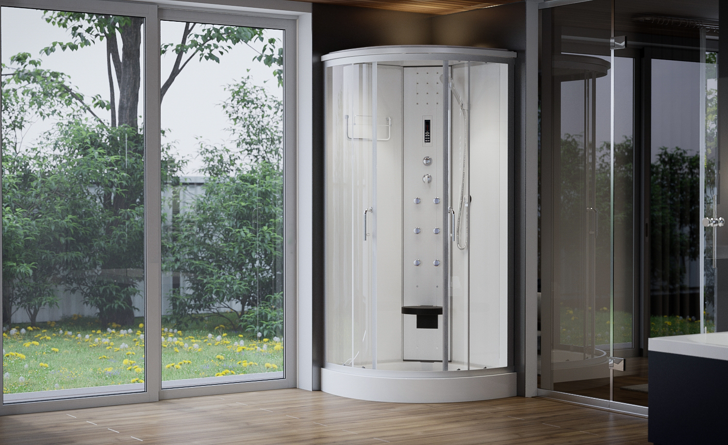 Negyedköríves hidromasszázs zuhanykabin elektronikával 90x90x222cm. Hagyományos alakú (R550) üvegszál erősítéses, acél merevítésű, fehér színű, alacsony, akril zuhanytálca, állítható fém lábakkal. Matt króm alumíniumívek és profilok. 5 mm víztiszta biztonsági üvegek és ajtók. Fehér üveg hátfalak. Matt króm funkciós panel. 6 db hidromasszázs fúvóka. Rádió. Felső világítás. LED háttérvilágítás. Ventillátor. Vezetékes telefon csatlakozási lehetőség. Kézi zuhany. Felső esőztető zuhany. Felhajtható ülőke. Kerámia betétes keverőszelep és funkció váltó. Piperepolc. Mágneses ajtózár. Görgős ajtónyitás. Leeresztő szelep.