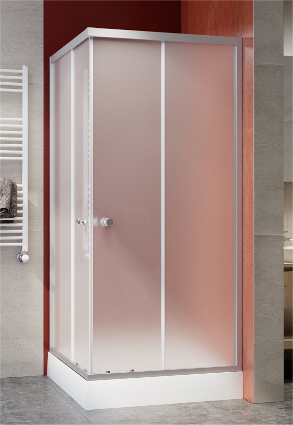 Szögeletes zuhanykabin 90x90x185cm 5 mm vastag , katedrál biztonsági üvegek és ajtók. Polírozott profilok. Mágneses ajtózár. Görgős ajtónyitás. Krómozott fogantyúk. A mintázott üveg részben átlátható, így biztosítja az intim teret a zuhanyzás során anélkül, hogy teljesen elzárna.