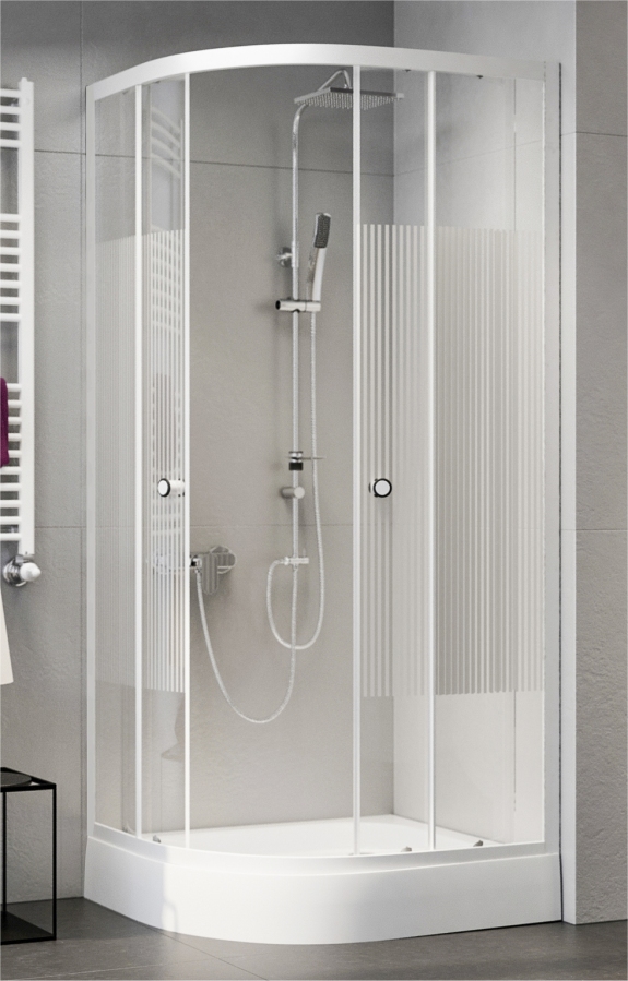 Zuhanykabin tálcával, negyedköríves, hajszálcsíkos üveggel, fehér 80x80x200