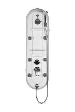 Hidromasszázs zuhanypanel 110x33,5 cm Fehér színű műanyag zuhanypanel 6 hidromasszázs fúvóka Beépített piperepolc Kerámia betétes keverőszelep és funkcióváltó Kézi zuhany Felső zuhany